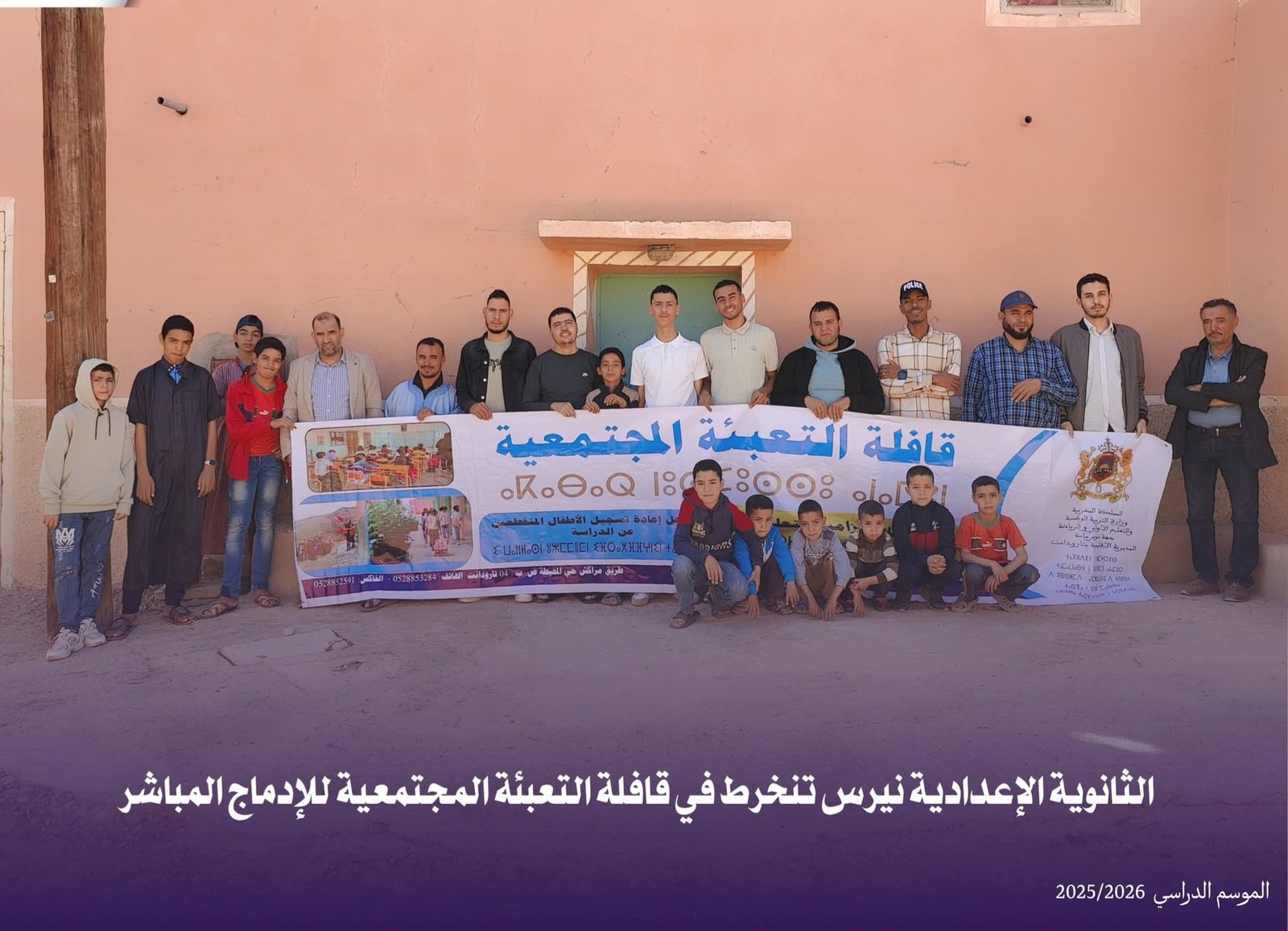 تفعيلاً لمقتضيات القانون الإطار 51.17، وتنزيلاً لبرامج خارطة الطريق 2022-2026، ولاسيما ما يتعلق بمحاربة ظاهرة الهدر المدرسي وتقليص حدّته، نظّمت الثانوية الإعدادية نيرس يوم السبت 1 نونبر 2025 قافلة التعبئة المجتمعية للإدماج المباشر وإعادة تسجيل التلاميذ المنقطعين وغير الملتحقين.